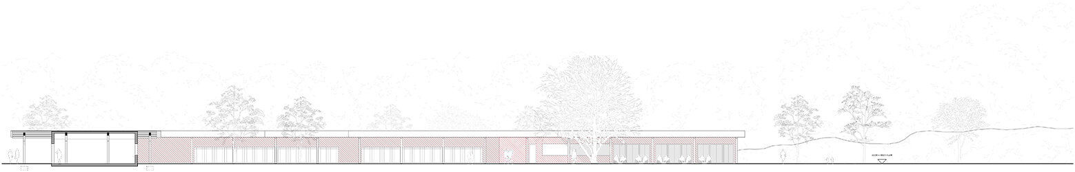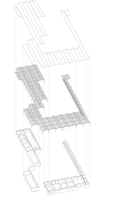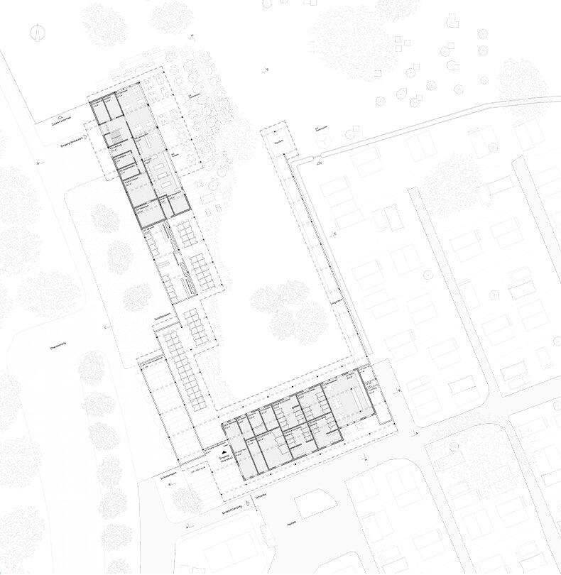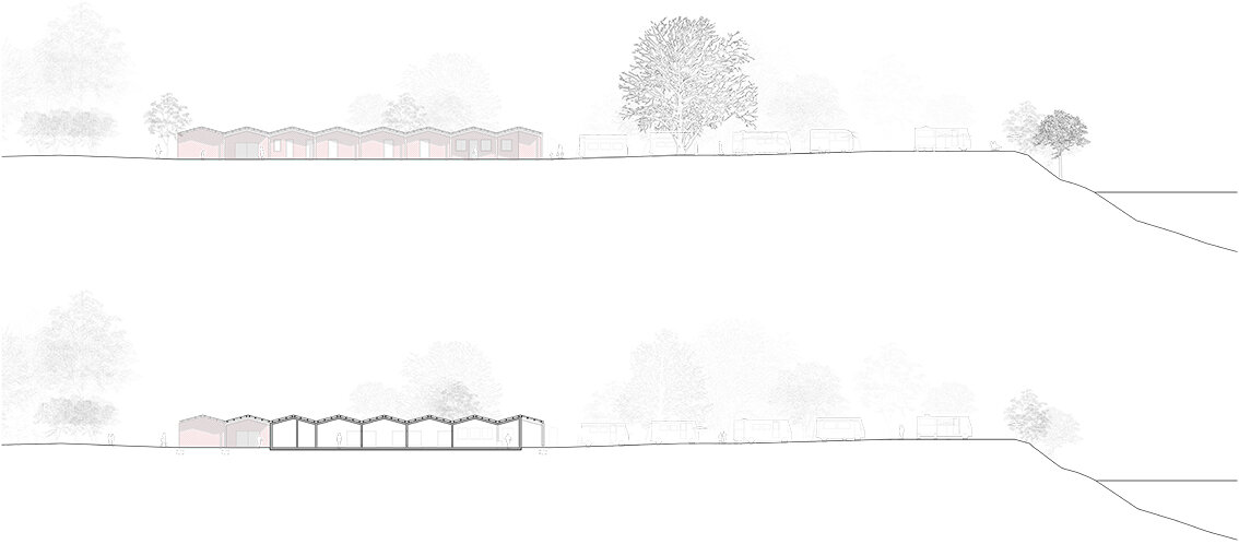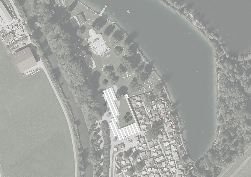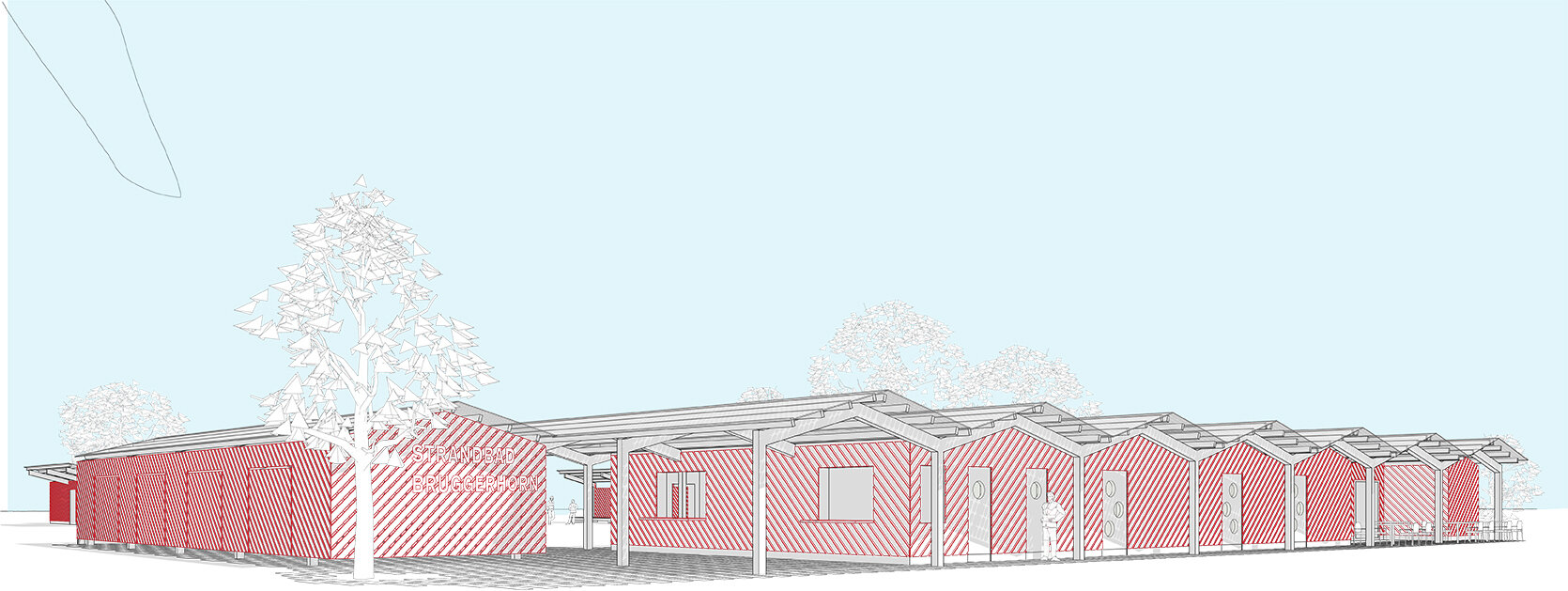 Die an Strandarchitektur erinnernden Satteldachserien mit Veranda und die kreuzweise verschalten Aussenwänden transportieren eine leichte und sommerliche Stimmung. Einem Blätterdach gleich beschatten die halbtransparenten Photovoltaikpanels alle gedeckten Aussenbereiche. Von Aussen werden sofort die zwei durch das Tragwerk geprägten verschiedenen Seiten des Bauwerks sichtbar: Die abgestufte, fast geschlossene Westseite neben der Südseite mit der Satteldachserie und der vorgelagerten Verandaschicht. Nach Innen entpuppt sich das Bauwerk grösstenteils als halboffener Raum unter dem zusammenfassenden Dach.