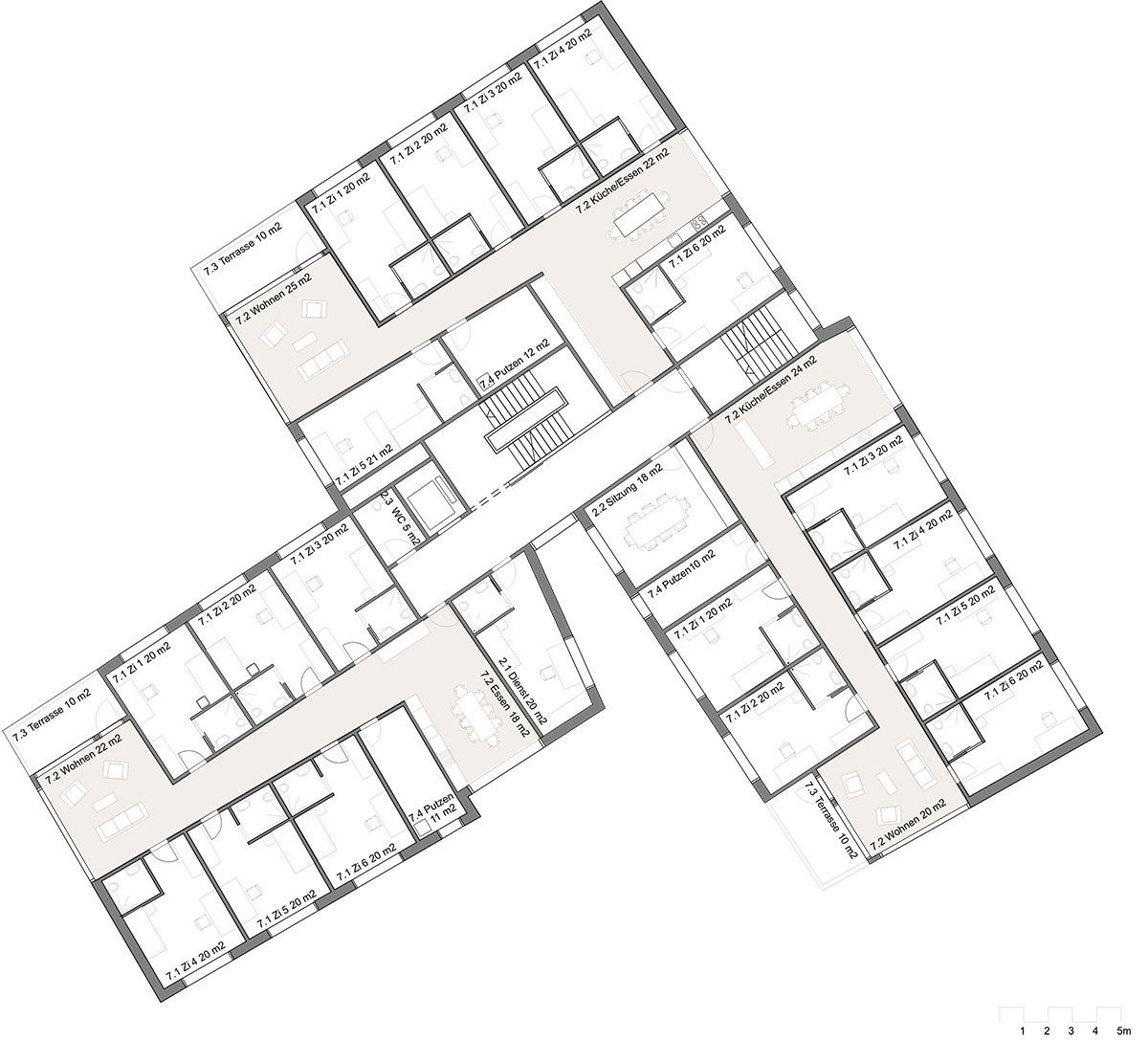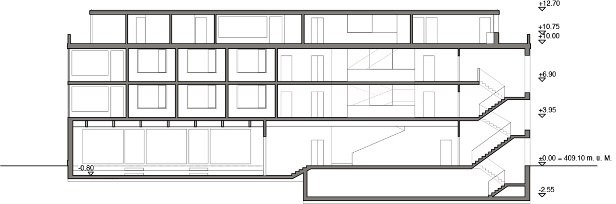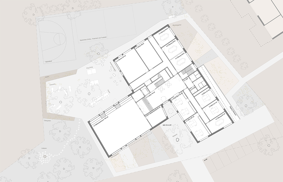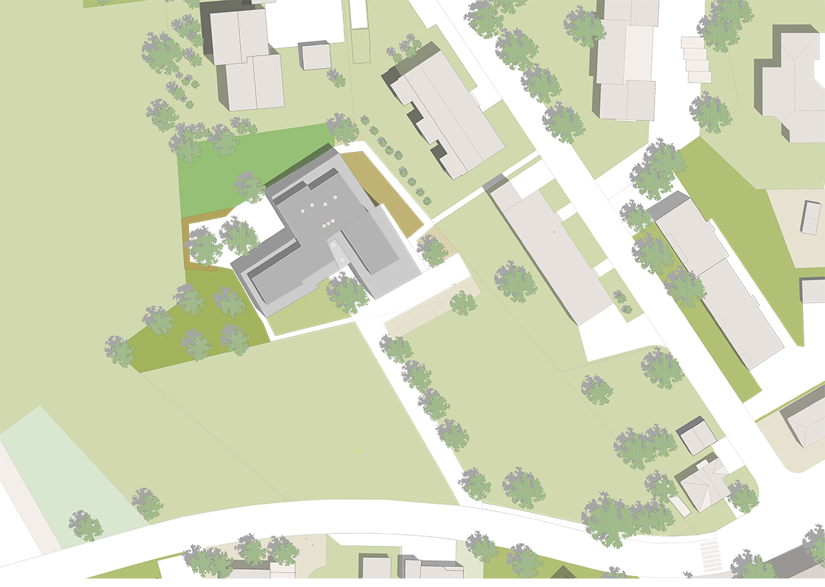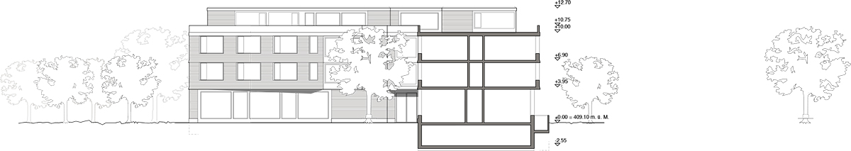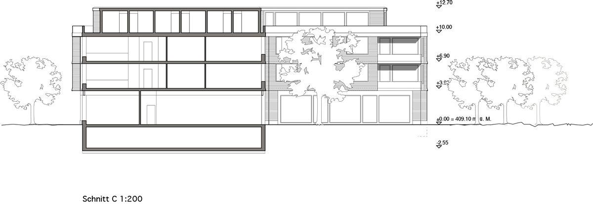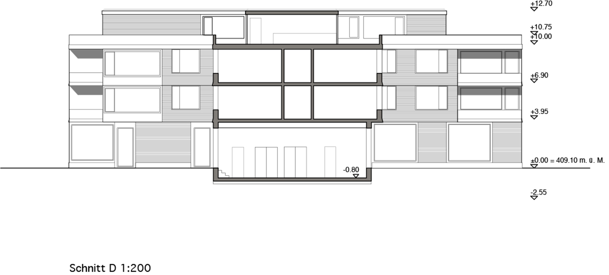 Die ländlich geprägte Umgebung in Romanshorn inspirierte zu einem Konzept, das durch die Setzung des Baukörpers unterschiedliche Orte als Felder ausscheidet und sich doch in die grosse Wiese einbettet. Um das relativ grosse Gebäude als einladendes Wohnhaus erscheinen zu lassen, wird der Baukörper gestaffelt und eine Fassade aus Eternitschindeln vorgeschlagen. Die Wohnungen sind alle mit einem geteilten Wohn- und Essbereich ausgestattet, die auch nach verschiedenen Himmerlsrichtungen orientiert sind.