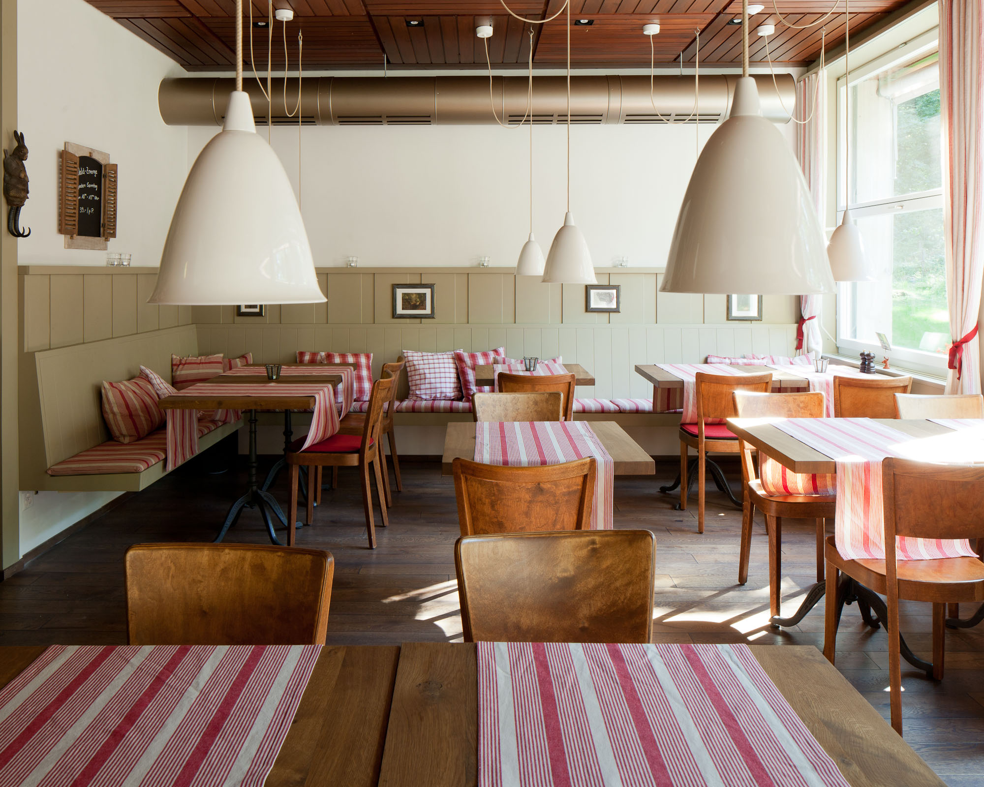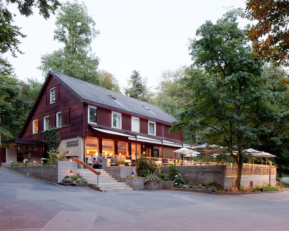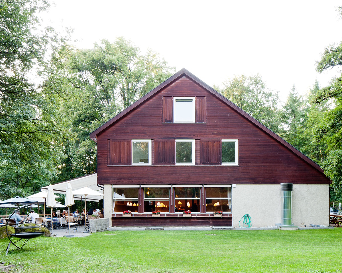 Das Ausflugsrestaurant im Wald muss technisch saniert werden und der Gastraum wird innen neu gestaltet. Der Haupteingang wird neu zur Terrasse gelegt und eine Trennwand ausgebrochen zugunsten eines grosszügigen Raumeinducks. Um die unterschiedlich orientierten Fensterfronten in Beziehung zu setzen, werden alle Wände sowie der Windfang des neuen Eingangs als zusammenhängende Abwicklung gestaltet. Der umlaufende Horizont, bestehend aus Sitzbank und lackierter Holzverkleidung, fasst den Raum zusammen und bildet eine robuste Kulisse für den Gastraum, die den Anforderungen einer intensiven Nutzung standhalten kann.