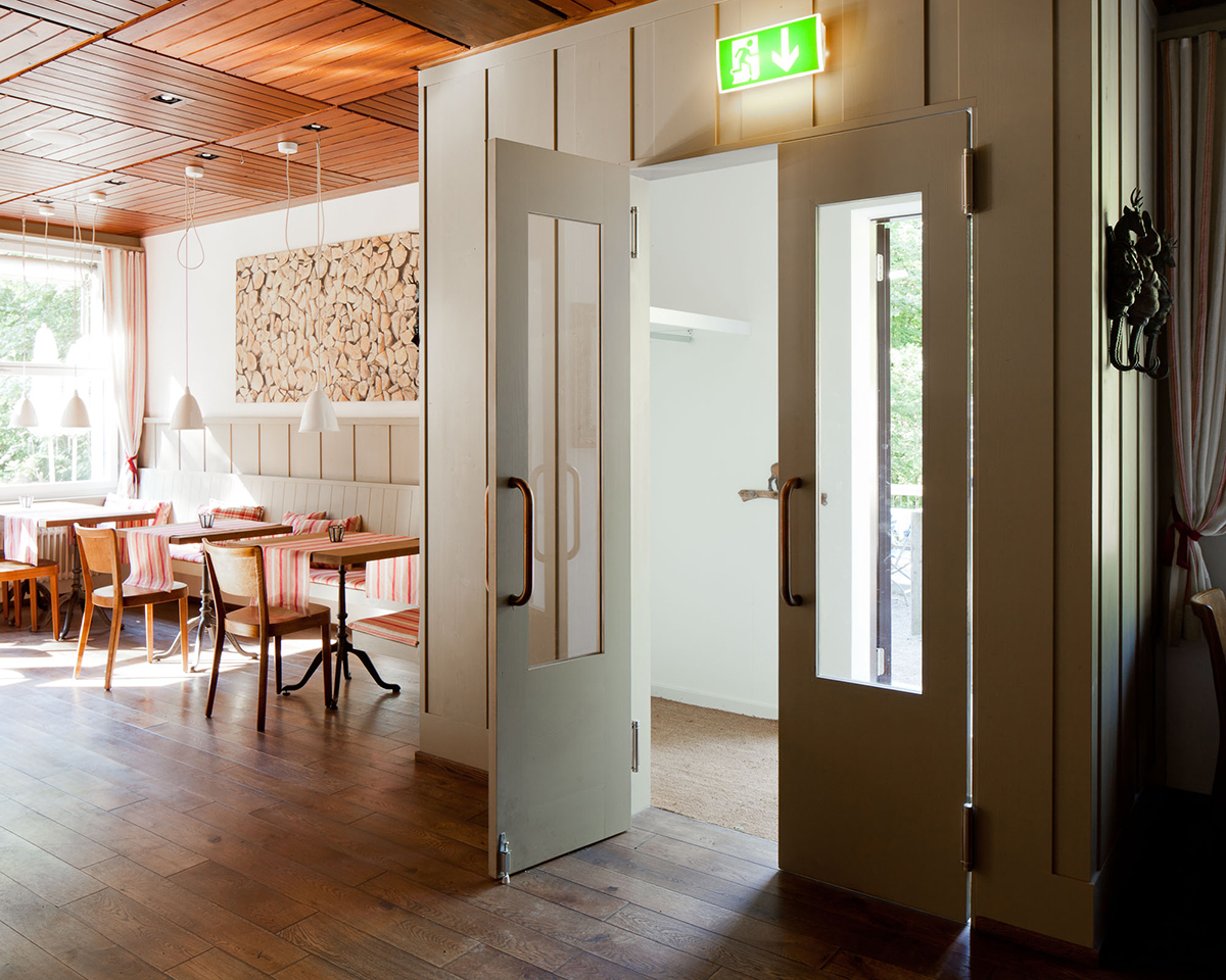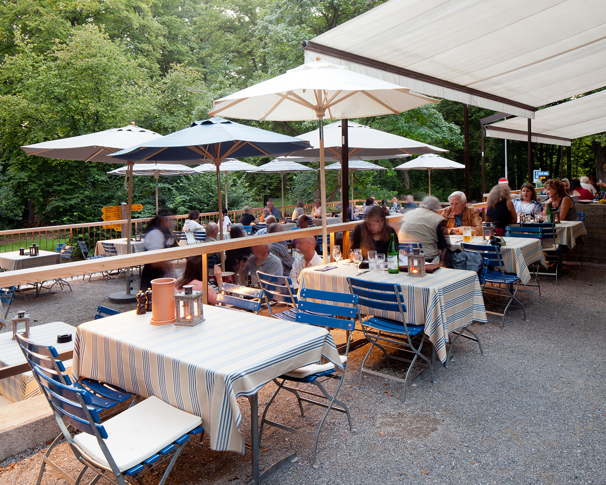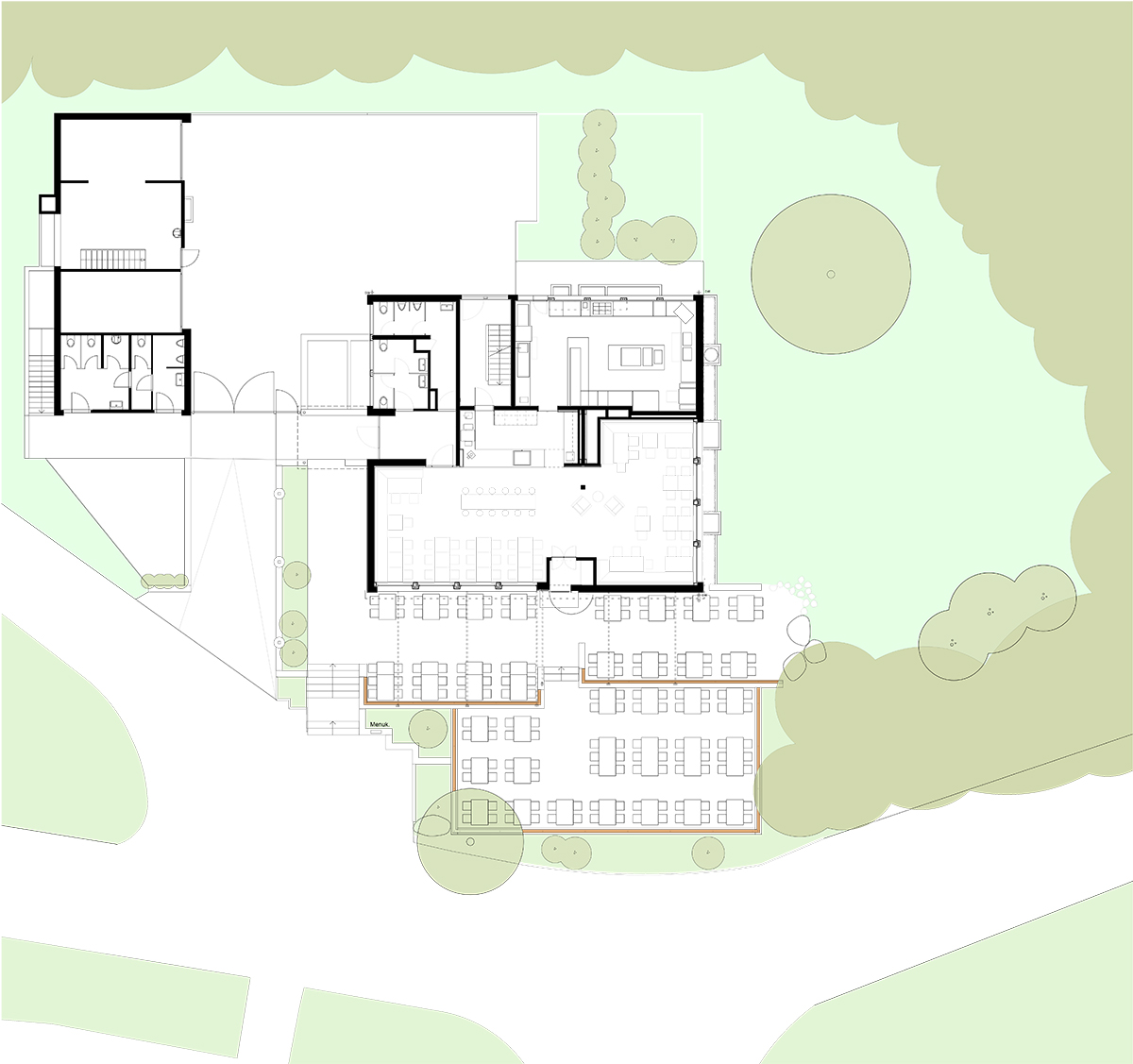 Das Ausflugsrestaurant im Wald muss technisch saniert werden und der Gastraum wird innen neu gestaltet. Der Haupteingang wird neu zur Terrasse gelegt und eine Trennwand ausgebrochen zugunsten eines grosszügigen Raumeinducks. Um die unterschiedlich orientierten Fensterfronten in Beziehung zu setzen, werden alle Wände sowie der Windfang des neuen Eingangs als zusammenhängende Abwicklung gestaltet. Der umlaufende Horizont, bestehend aus Sitzbank und lackierter Holzverkleidung, fasst den Raum zusammen und bildet eine robuste Kulisse für den Gastraum, die den Anforderungen einer intensiven Nutzung standhalten kann.