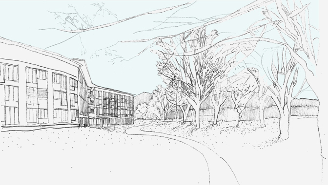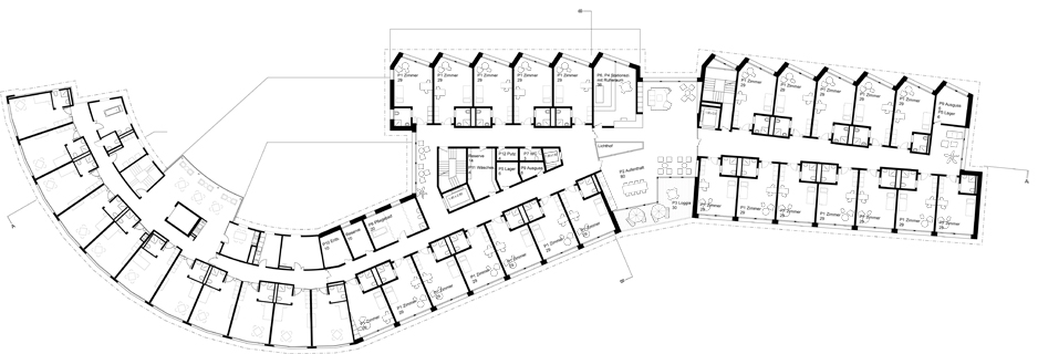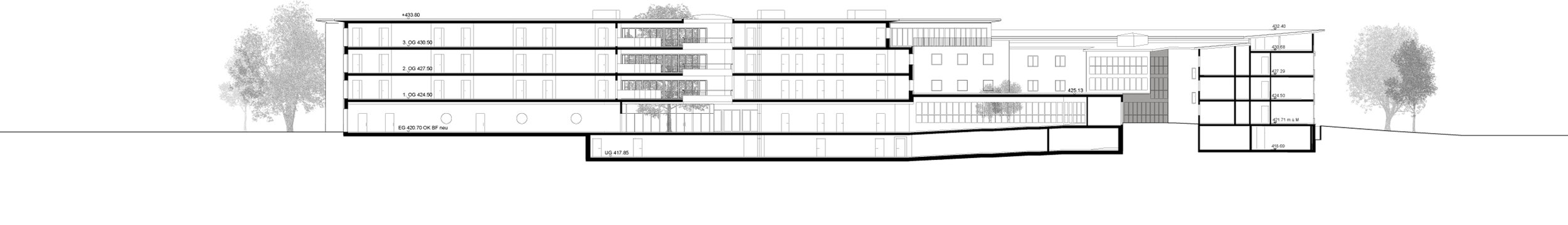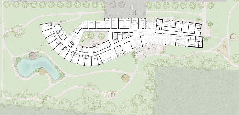 Ein bestehendes Altersheim wird vergrössert, wobei der viertelkreisförmigle Zimmertrakt aus den 1990-er Jahren erhalten werden muss. Um den schönen Garten möglichst gross zu erhalten wird das Volumen schmal und lang.