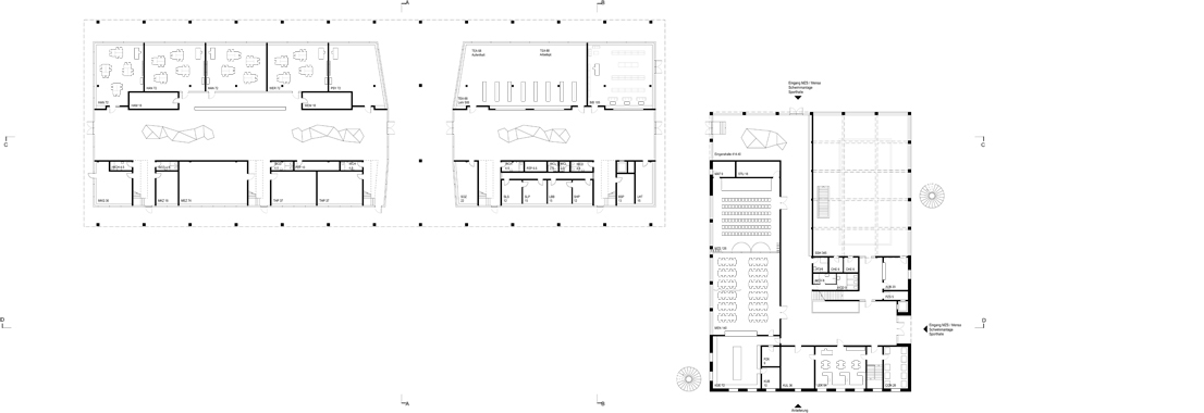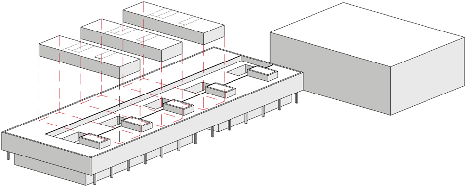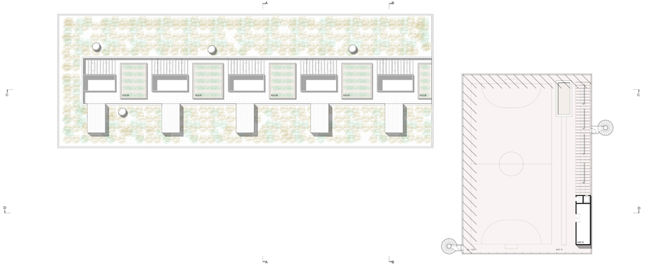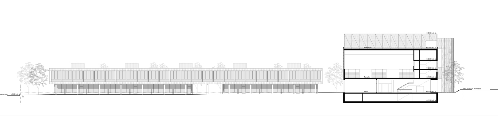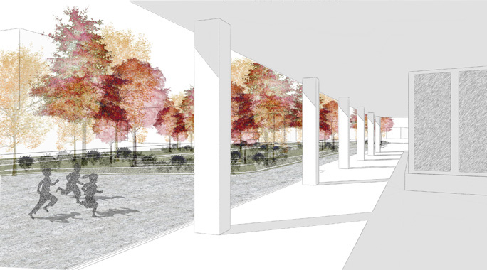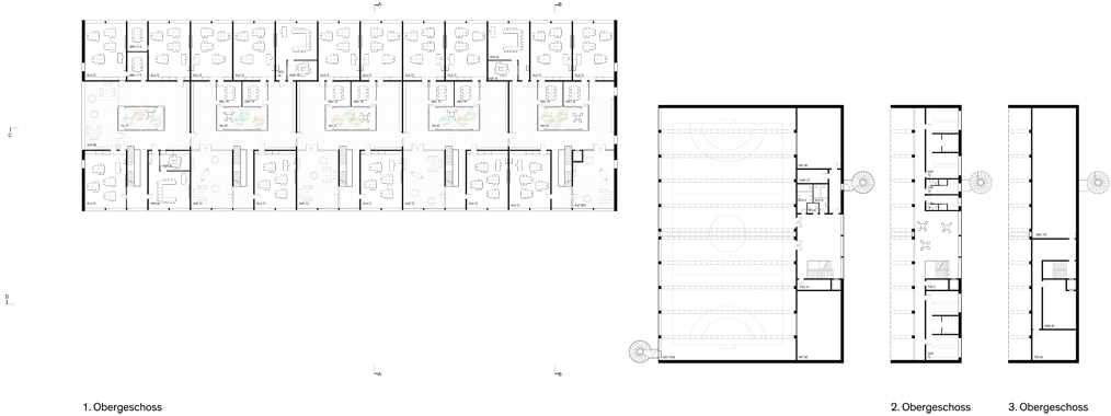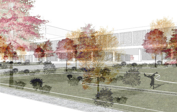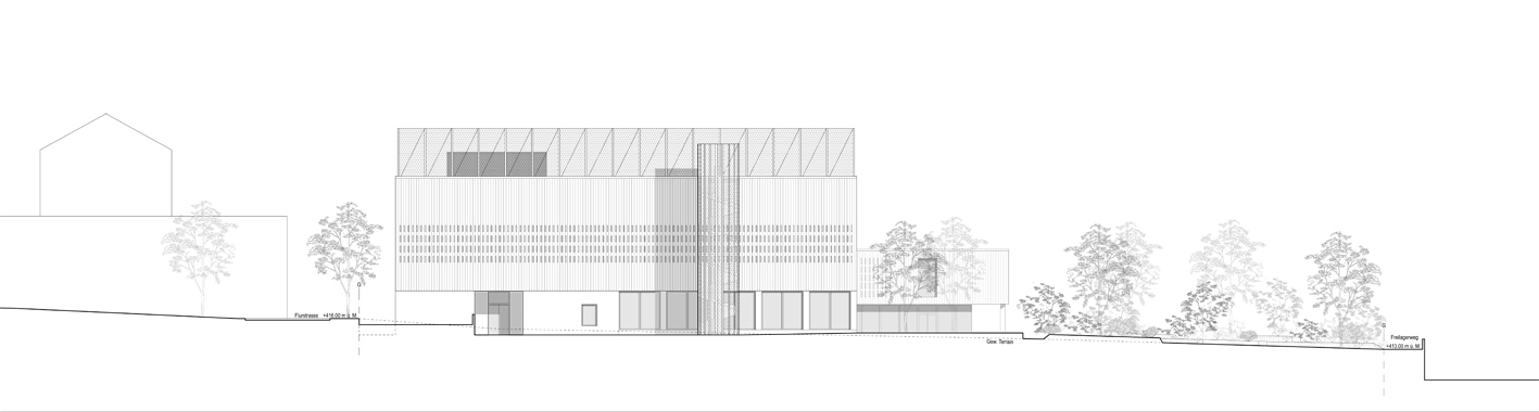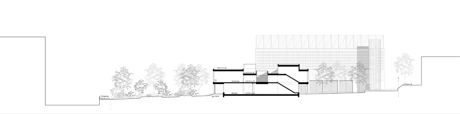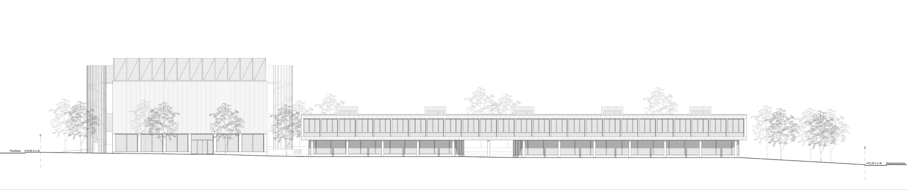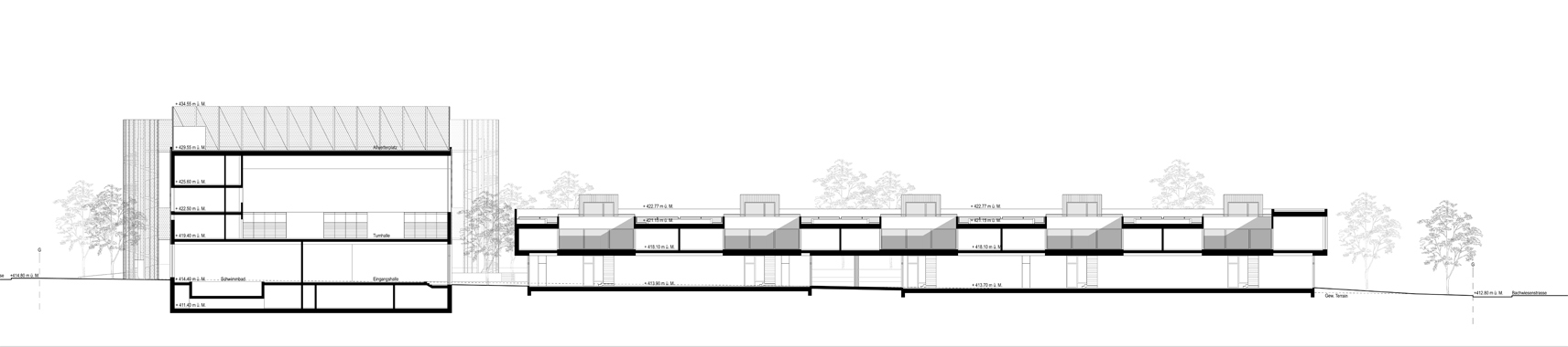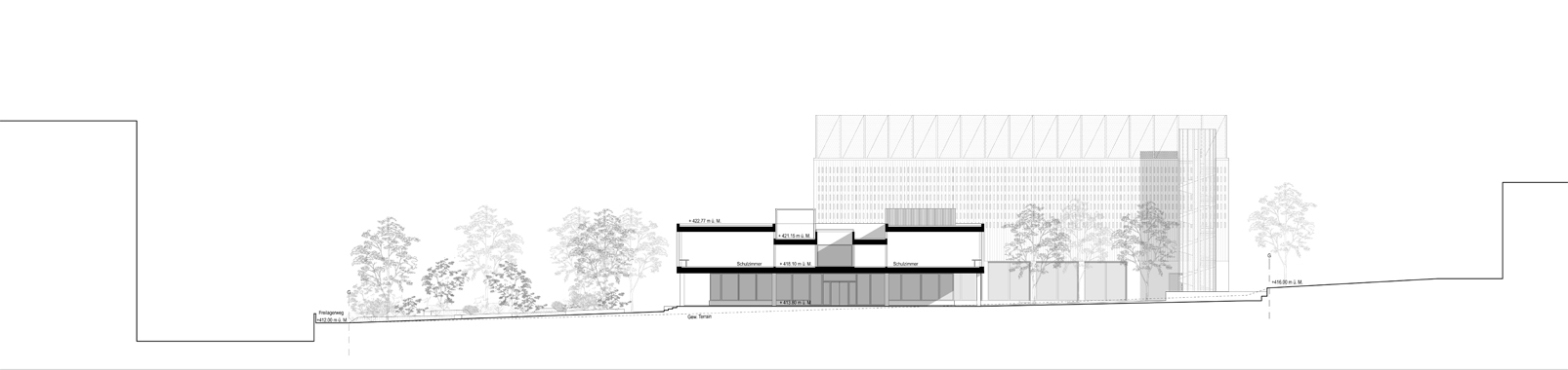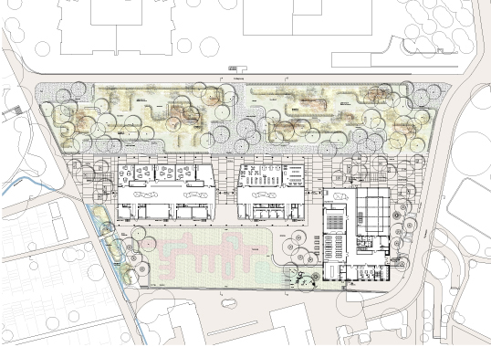 Die wichtigsten Elemente in der Situation sind der öffentliche Park, die neue Schule und der Schulhof. Die Promenade ist dabei ein zentrales Element: sie ist die neue Adresse und vermittelt zwischen dem Park und der Schulwelt. Das Ensemble des Sporthallenbaus und des flachen Schulhauses bilden eine städtebauliche Überleitung zwischen dichtem Wohnquartier und offenem Grünzug um den Albisrieder Dorfbach und dem Gemeinschaftszentrum Bachwiesen.