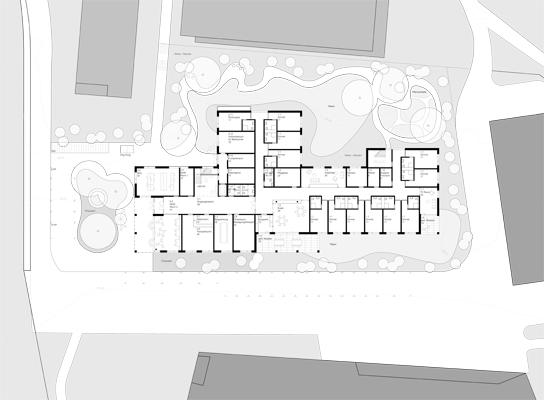 Durch das gestaffelte Volumen und dessen Lage dicht am südlichen Nachbargrundstück entstehen unterschiedliche Räume um das Gebäude herum. Zudem wird mit dem gegliederten Volumen eine Massstäblichkeit erreicht, die mehr mit Wohnen als mit grossen Institutionen in Verbindung gebracht wird.