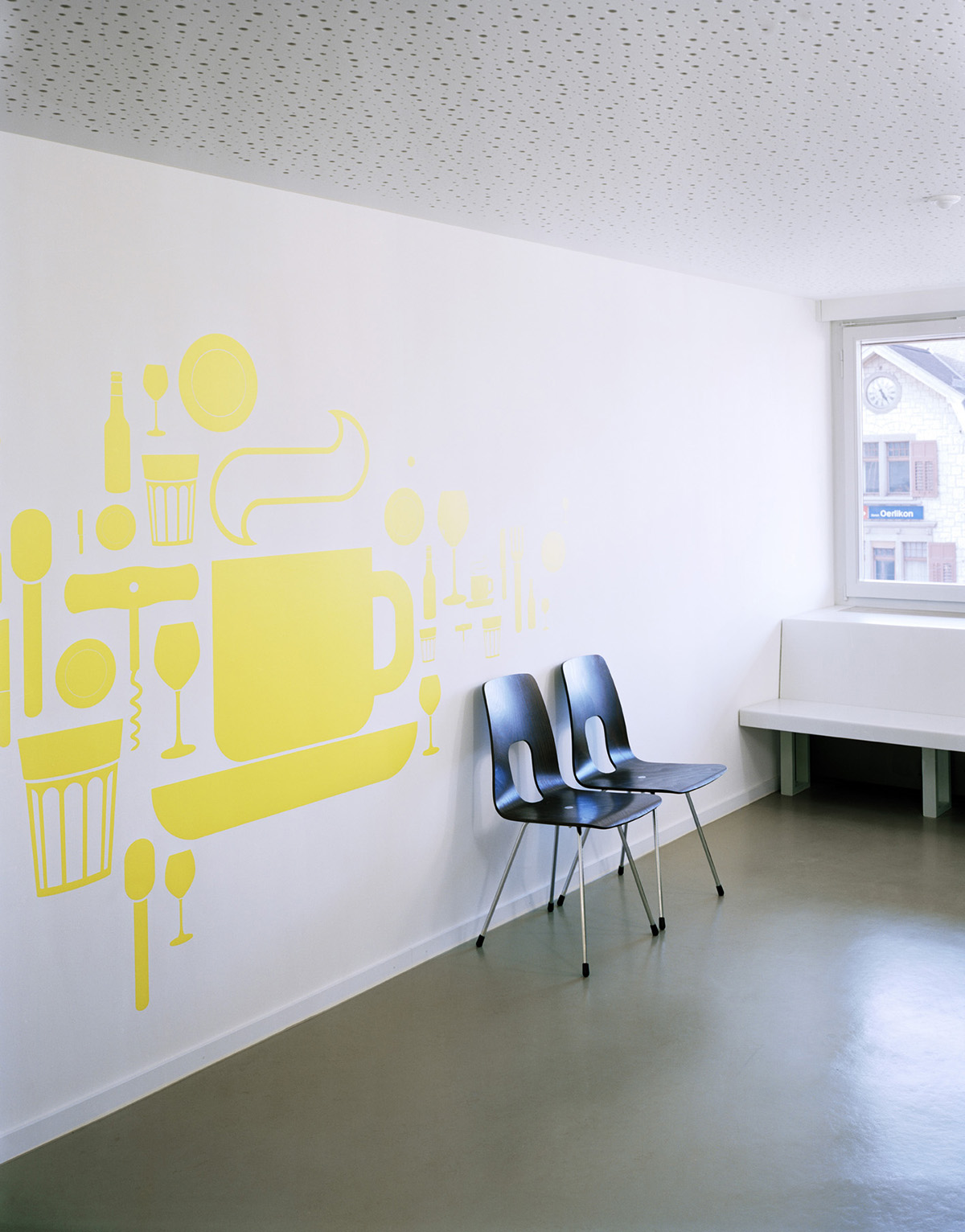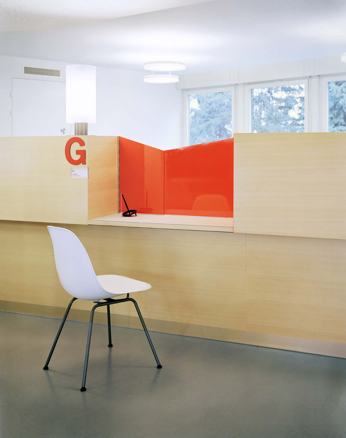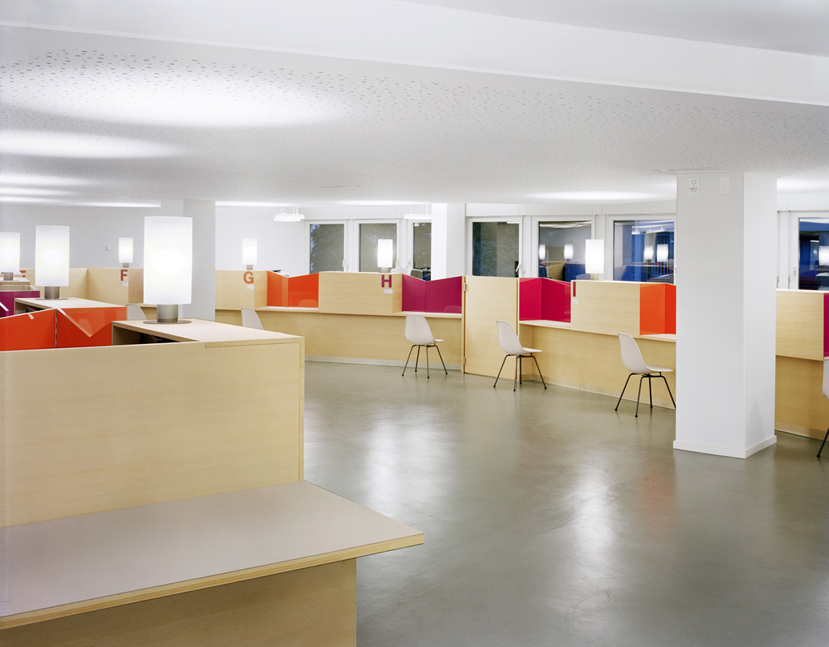 Für das Bevölkerungsamt der Stadt Zürich wurden am Bahnhof Örlikon eine Schalterhalle sowie die zugehörige Infrastruktur in ein bestehendes Bürohaus eingebaut. Das Herzstück der Anlage, die Schalterhalle, ist so gelegt, dass der Kundenbereich Fassadenanstoss hat und die Wartenden das rege Treiben am Bahnhof Oerlikon beobachten können. Die elf Schalter sind im strengen Geschossgrundriss als amorphe Raumkonfiguration aufgespannt. Durch die gespiegelten Arbeitsplätze, deren Trennwände einseitig leuchtend bemalt sind, verändert sich im Durchschreiten die Perspektive ständig. Die Atmosphäre wird vom hellen Holz, den satten Farben und der Beleuchtung unkompliziert und freundlich gestaltet.