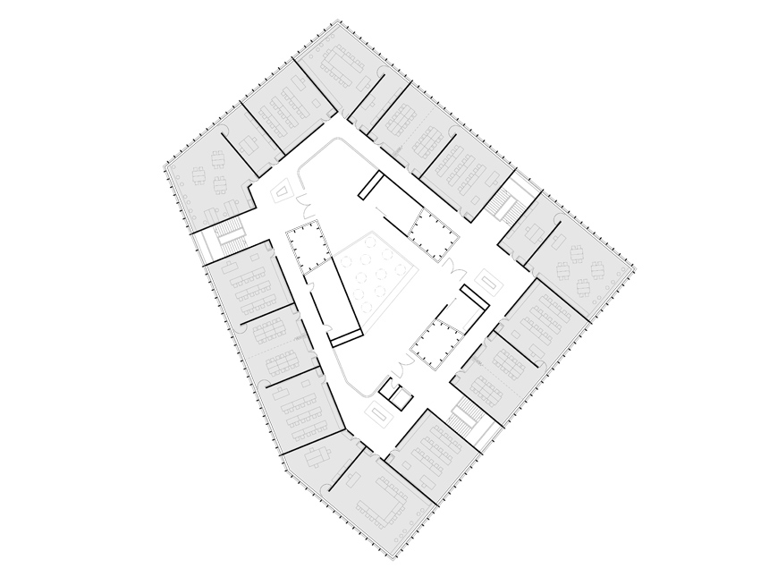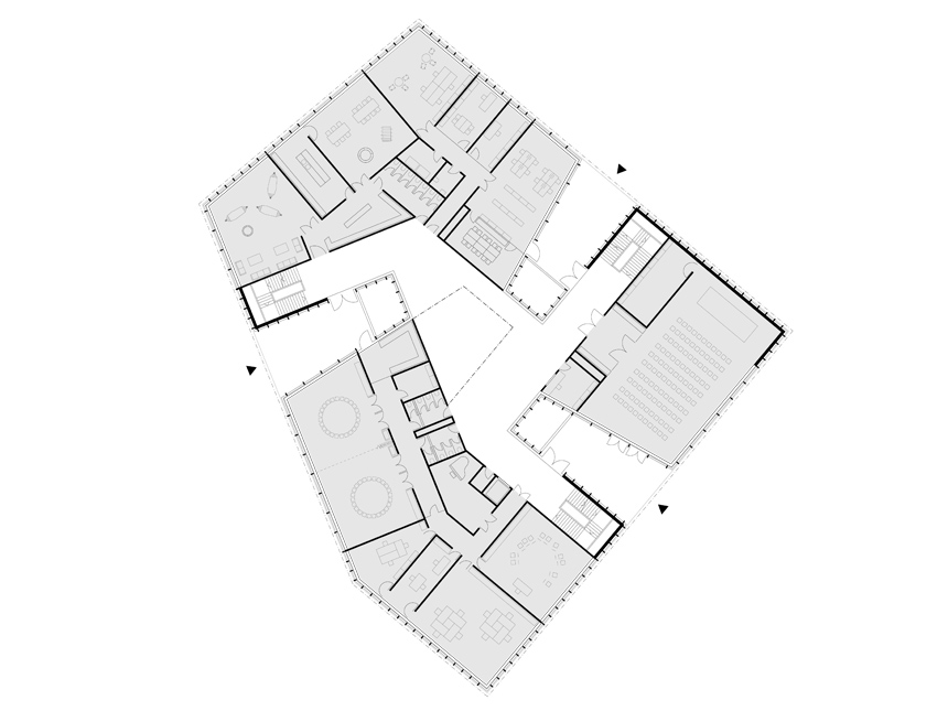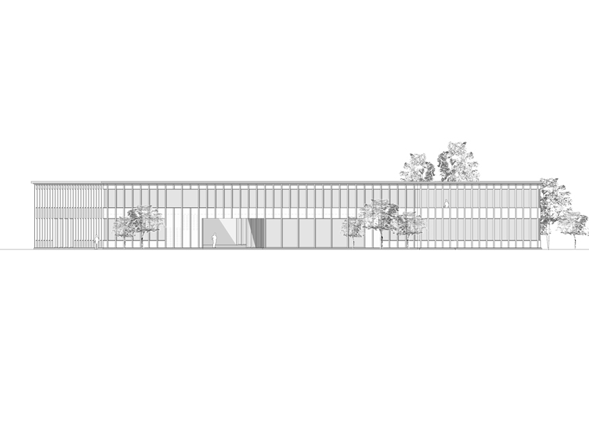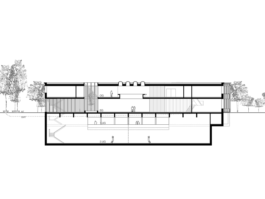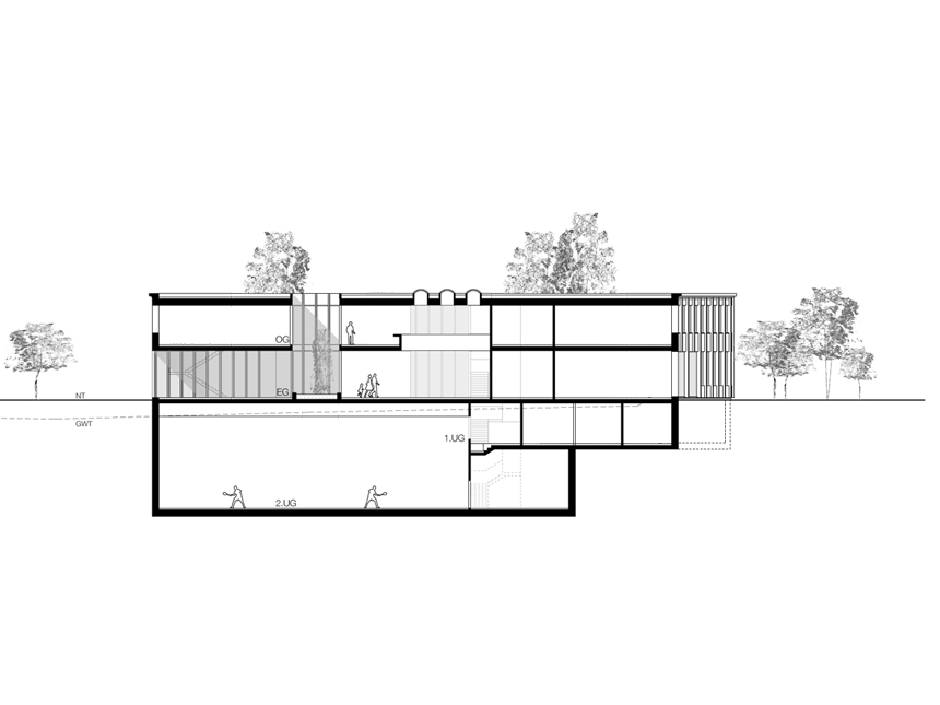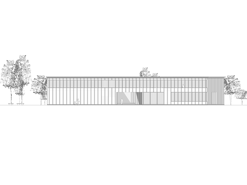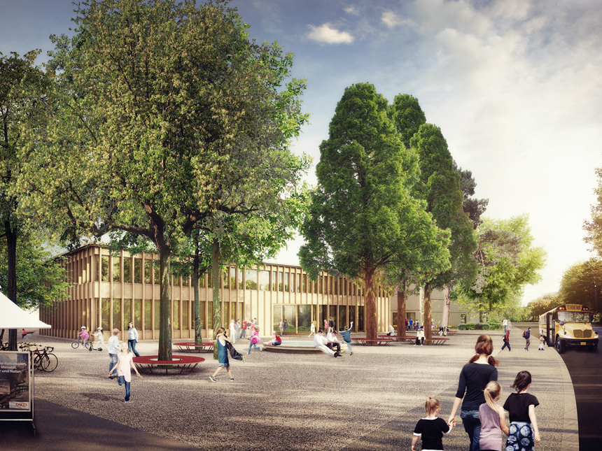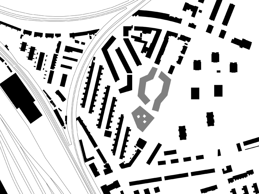 Während sich das südliche Areal mit der Schule dadurch auszeichnet, dass der sperrige Baukörper Räume ausscheidet und bestimmt, bilden die beiden Wohnungsbaukörper einen Raum in ihrem Innern, der primär den Bewohnern vorbehalten ist. Der markante Baumbestand ist ein wichtiger Parameter, auf den die vorgeschlagenen Baukörper entlang der Strasse mit einer freien Linie reagieren. Die Schule ist durch die zentrale, zweigeschossige Halle gegliedert; im Erdgeschoss scheidet sie drei Blöcke aus mit Aula, Kindergarten und Lehrerbereich, im Obergeschoss sind darum herum die Schulzimmer organisiert.