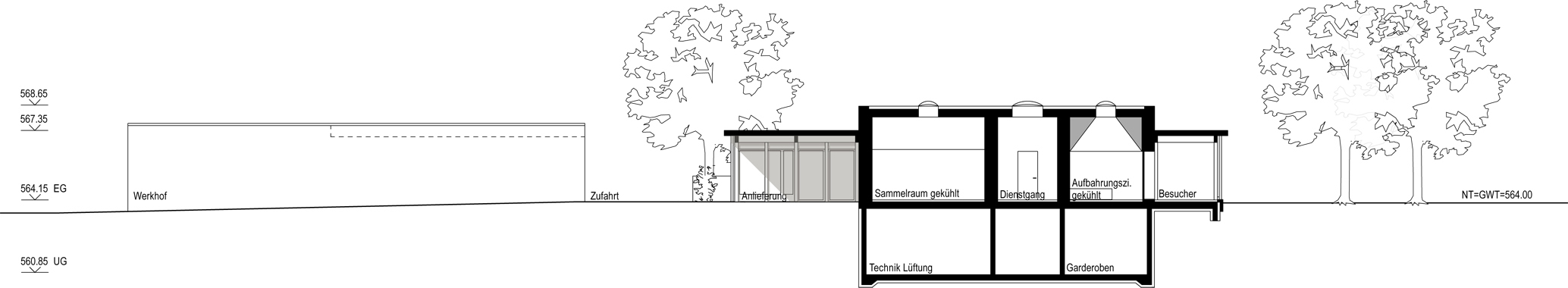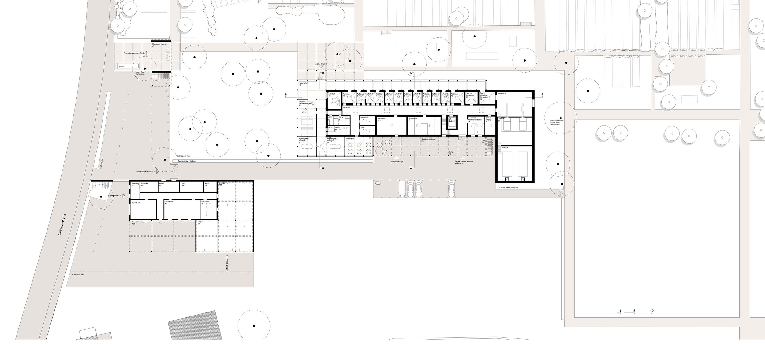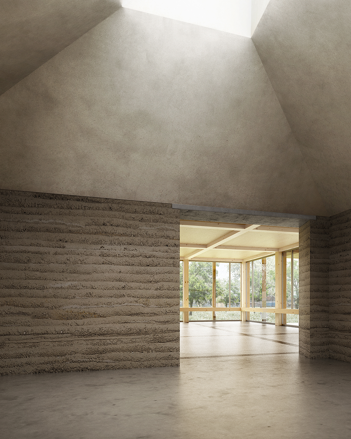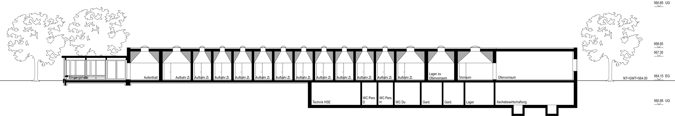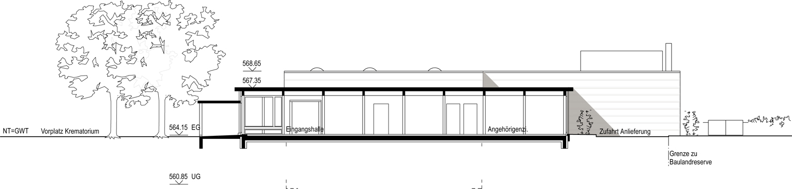 Zwei Baukörper schieben sich ineinander, der flache Filigranbau und der hohe, schwere Lehmbau. In den leichten Bauteilen befindet sich die Publikumsnutzung, im schweren Baukörper sind der Ofenraum, die Aufbahrungsräume und die technischen Räume, die weniger Licht benötigen, angeordnet.