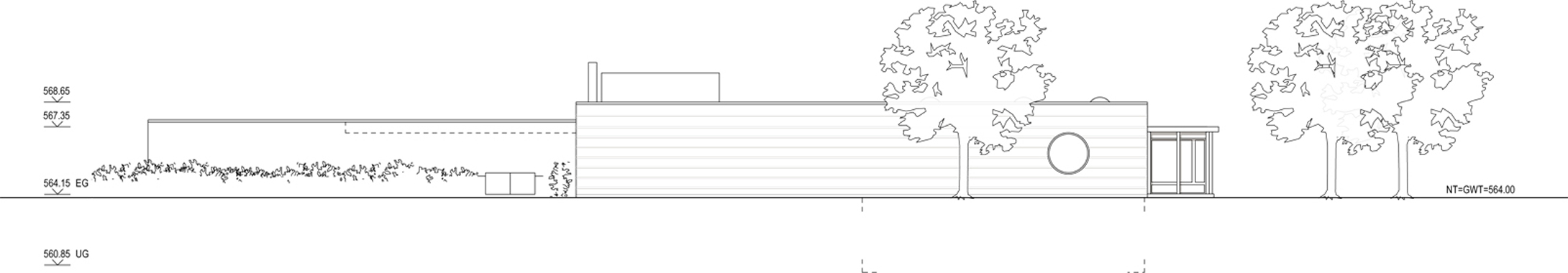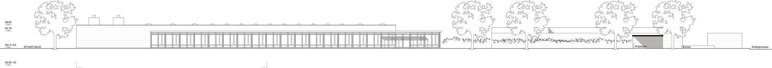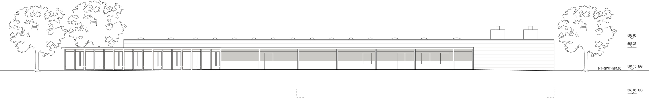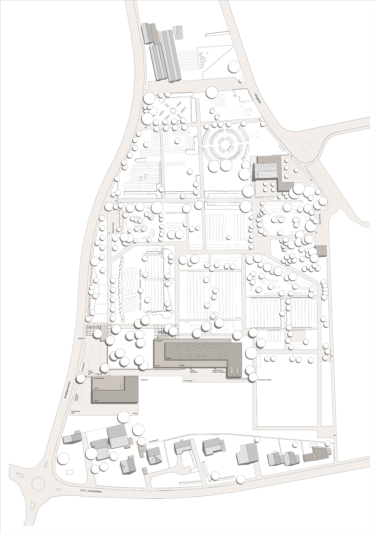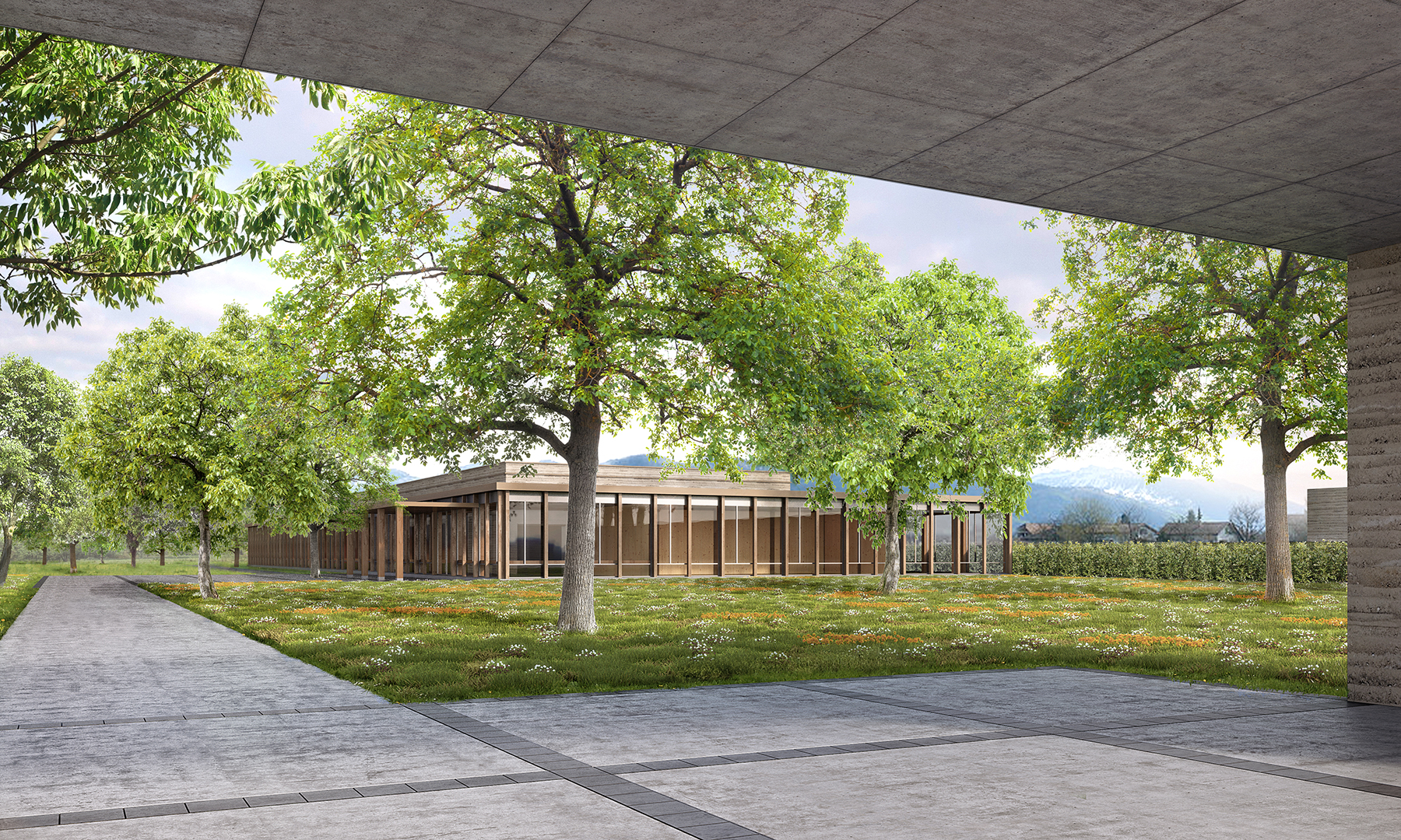 Zwei Baukörper schieben sich ineinander, der flache Filigranbau und der hohe, schwere Lehmbau. In den leichten Bauteilen befindet sich die Publikumsnutzung, im schweren Baukörper sind der Ofenraum, die Aufbahrungsräume und die technischen Räume, die weniger Licht benötigen, angeordnet.
