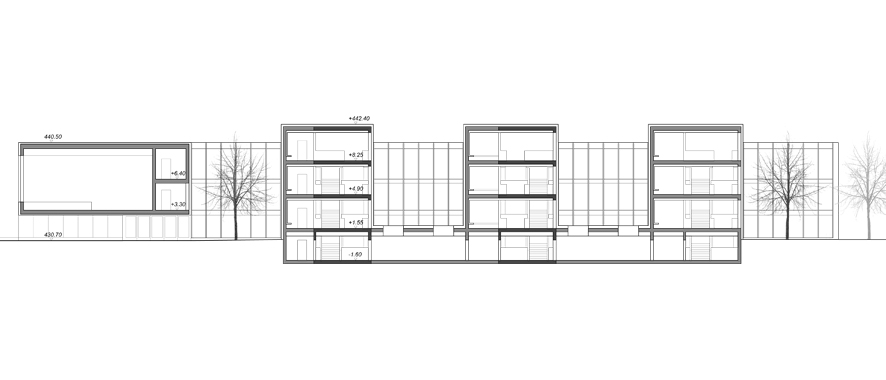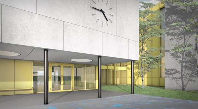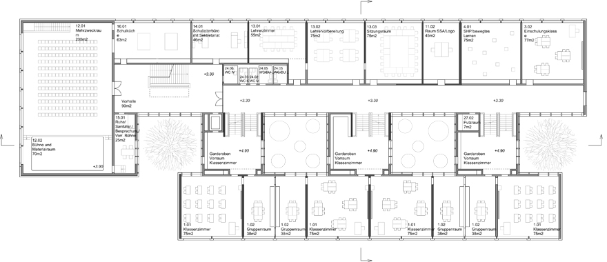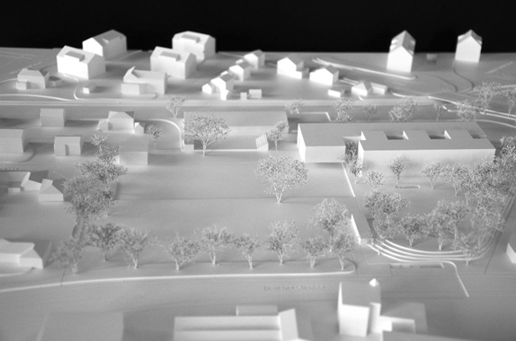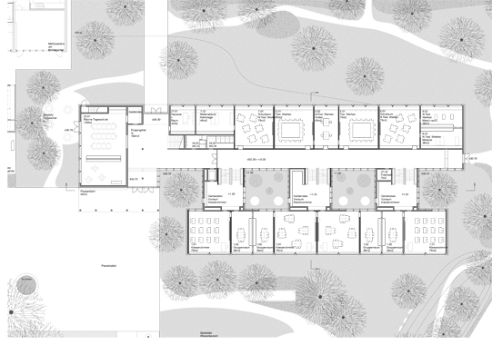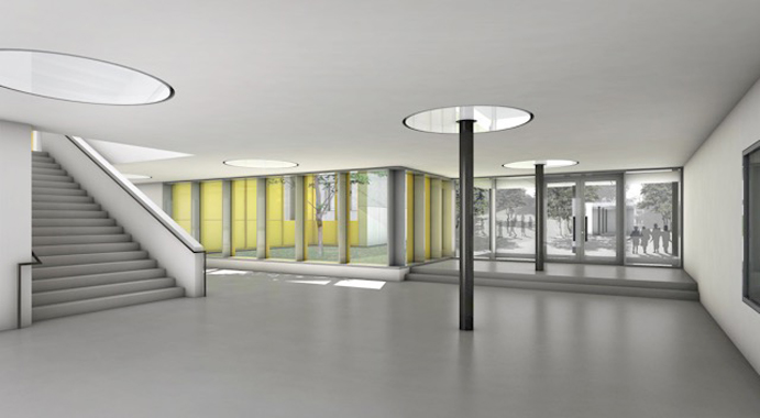 Auf dem Grundstück bleibt der grosszügige Aussenraum im Westen der Anlage vollkommen frei von Bebauung, zudem kann ein Grossteil der bestehenden, schönen Aussenanlagen belassen werden. Durch die Lage im Scharnier zwischen Wohn- und Industriegebiet passt sich das verlängerte Schulhaus gut in die Bebauungsstruktur ein. Der Ersatzbau mit dem vergrösserten Mehrzwecksaal klärt die Eingangssituation. Entscheidend bei der Neuinterpretation des Gebäudes ist die Aktivierung des bisherigen Untergeschosses, das zum Erdgeschossniveau mit grosszügiger Halle wird. Durch den Rückbau des Flachdachs werden die einzelnen Volumen besser lesbar.