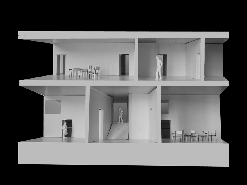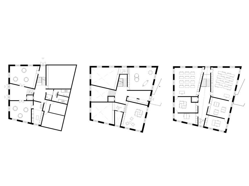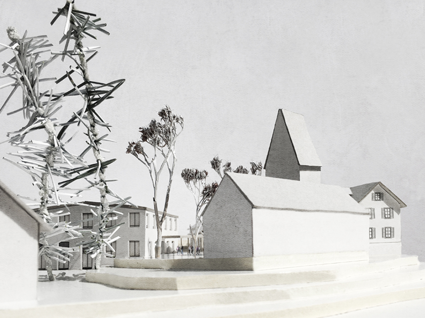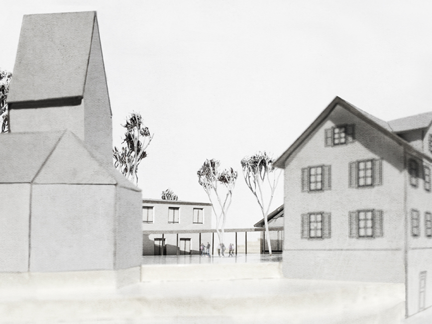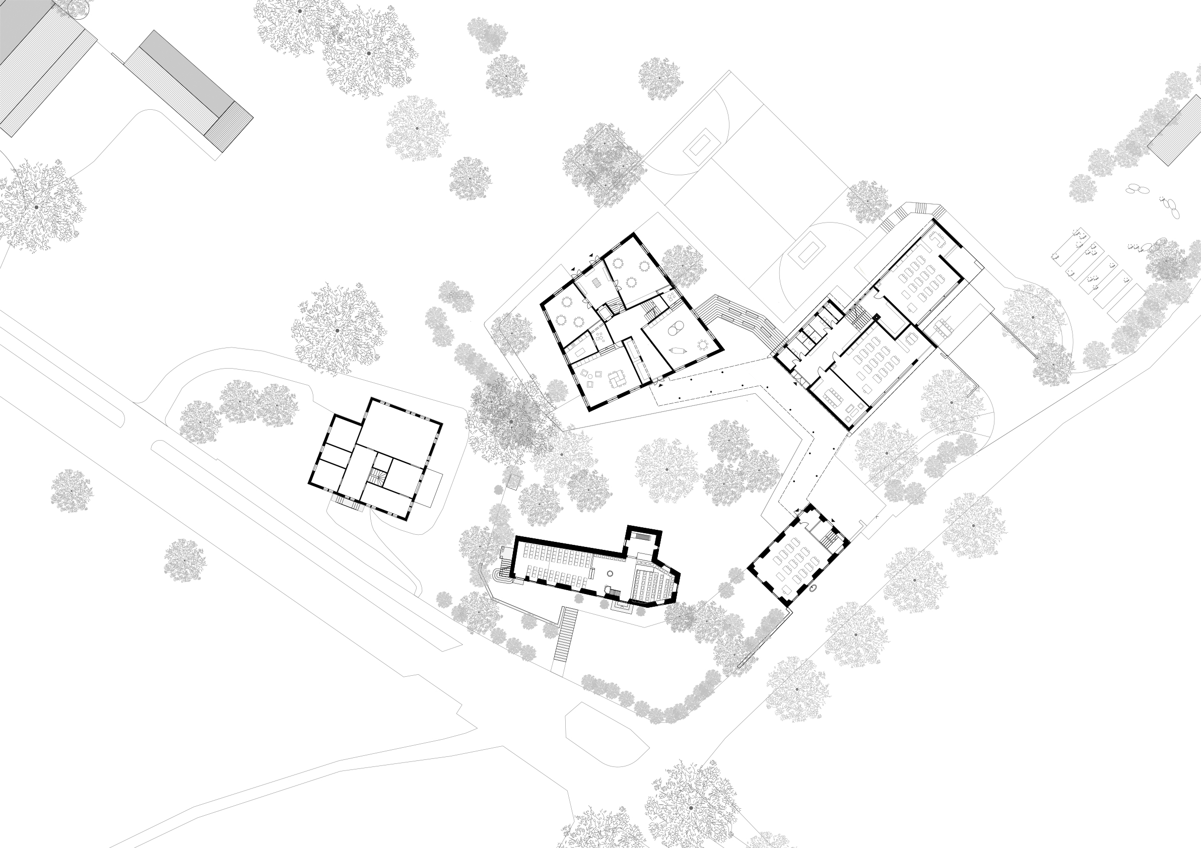 Der Wetzwiler Schulkosmos spielt sich schon seit längerem in mehreren Gebäuden sowie immer auch draussen ab, z.B. Turnen und Schulgarten (im Moment zwei Schulhäuser und zwei Provisorien). Dies empfinden wir als spezifische Qualität dieser kleinen, ländlichen Tagesschule. Das neue Schulhaus setzt diese Tradition fort und bildet ein autonomes Gebäude. Ein neues Vordach verbindet die drei Häuser, rahmt den Schulhof und ermöglicht eine Erschliessung trockenen Fusses. Vier grosszügige Eckräume mit Aussenraumbezug bilden die „Pfeiler“ der Tagesschule im Platz- und im Gartengeschoss.